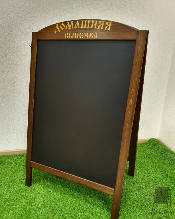Меловой штендер с гравировкой 70×107см двусторонний АРТИКУЛ: MS70-107-GR Меловой штендер с грифельным покрытием. Выполнен из дерева и имеет две пишущих поверхности для записей мелом или специальным меловым маркером. Штендер выполняется с гравировкой логотипа в верхней части с каждой стороны Материал: дерево, МДФ, грифельная эмаль Цвет пишущей поверхности: черный Цвет рамы: на выбор Размеры: 70×107 см Размер пишущей поверхности: 60×80 см Вес:7кг